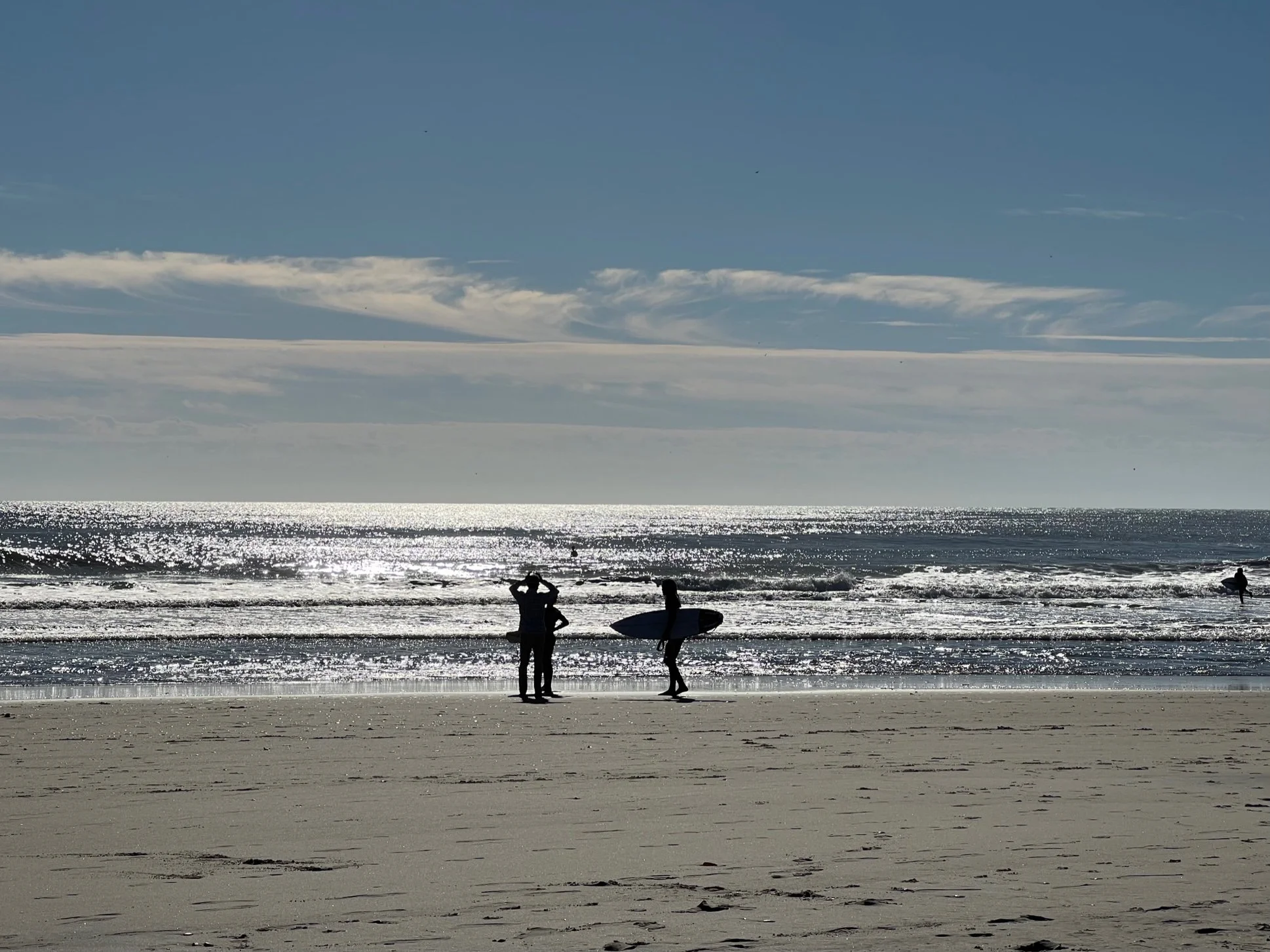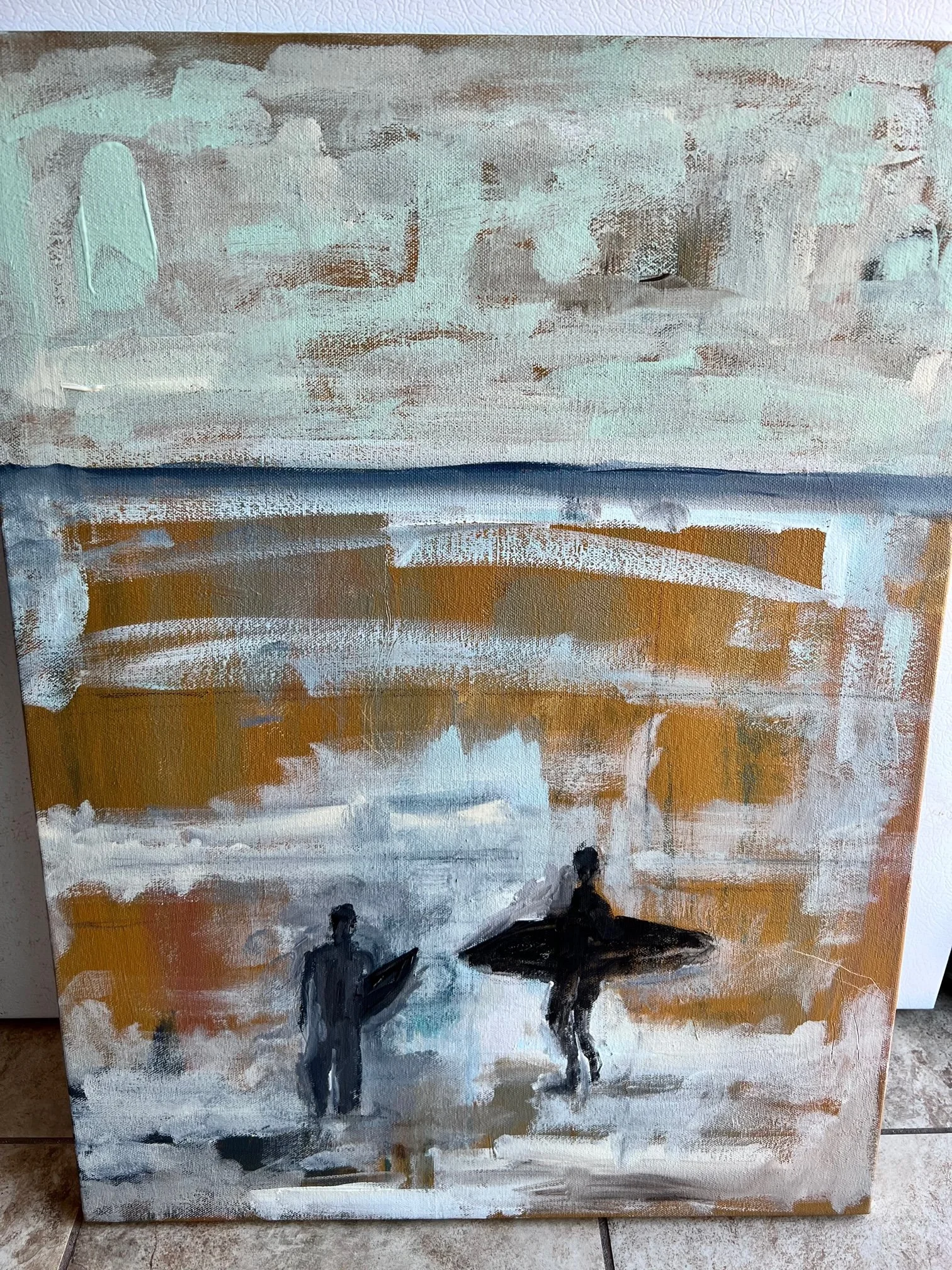 A little WIP… I love watching the surfers study the waves. They rarely get out and just turn their backs to the ocean. This is home to them. They stand at the edge for awhile. Seemingly traveling to another place with the wind and water. Photographic replayings and unlearnings, tucked away for later maybe… (And occasionally they run back in for one more.)